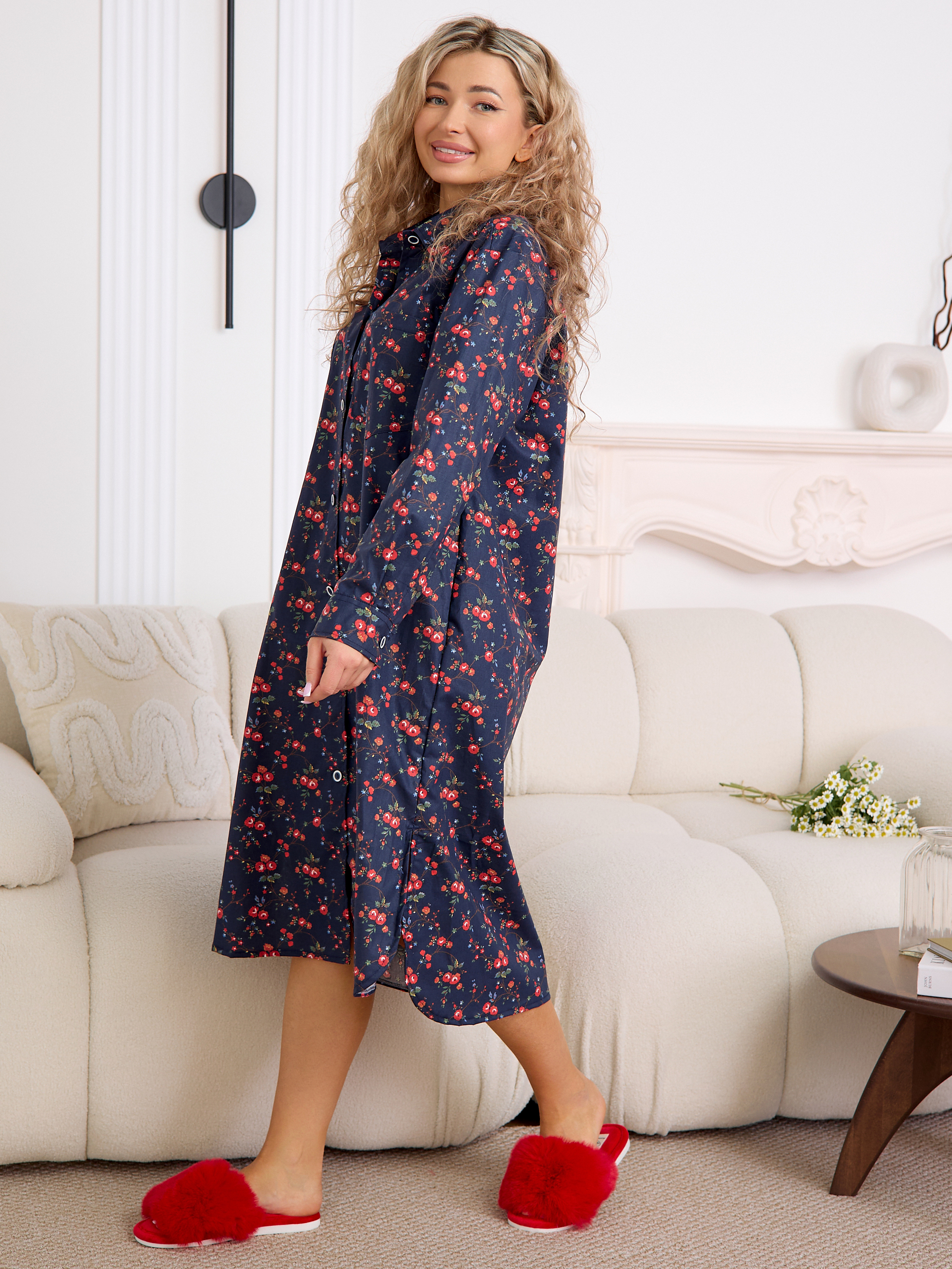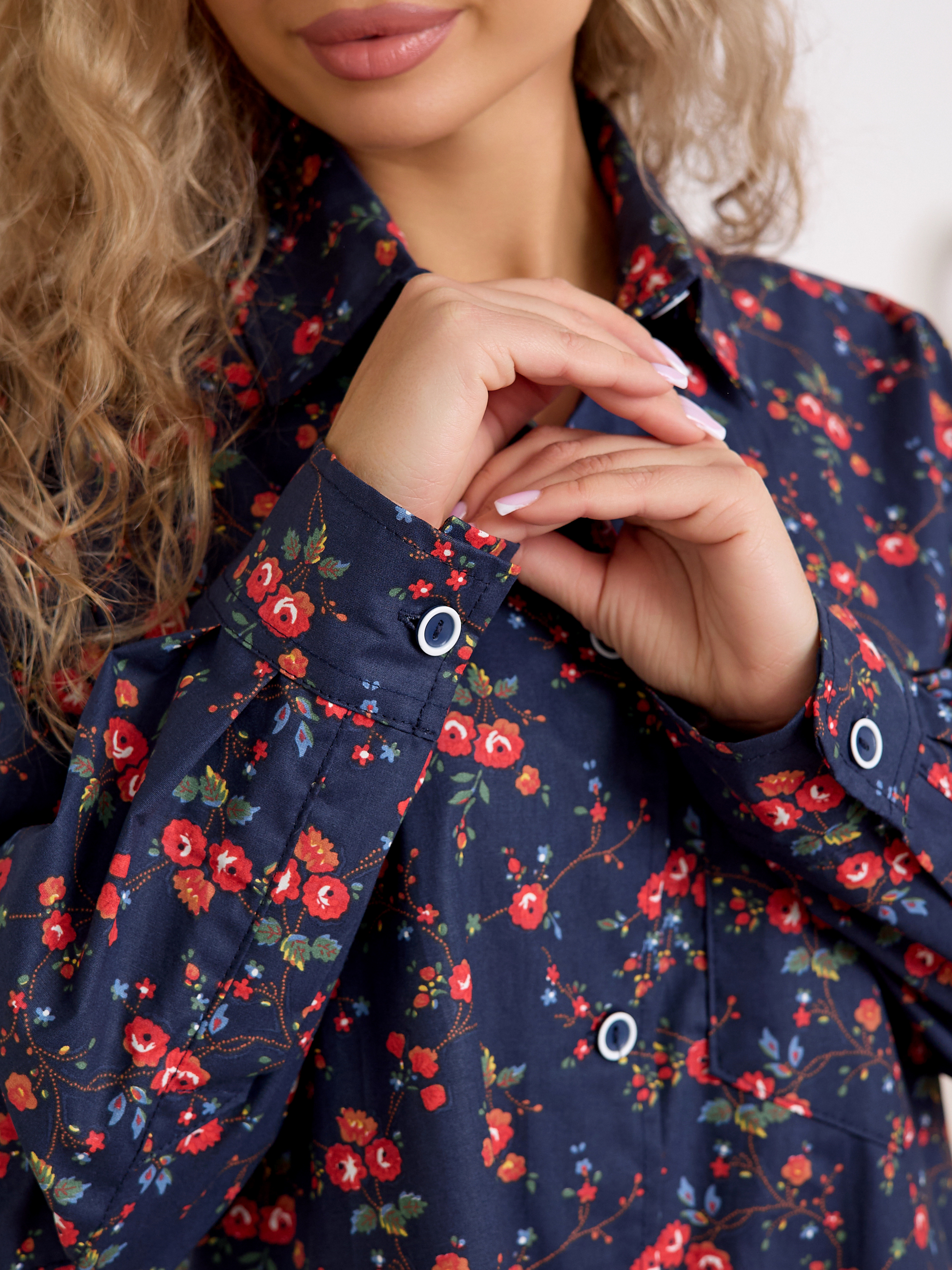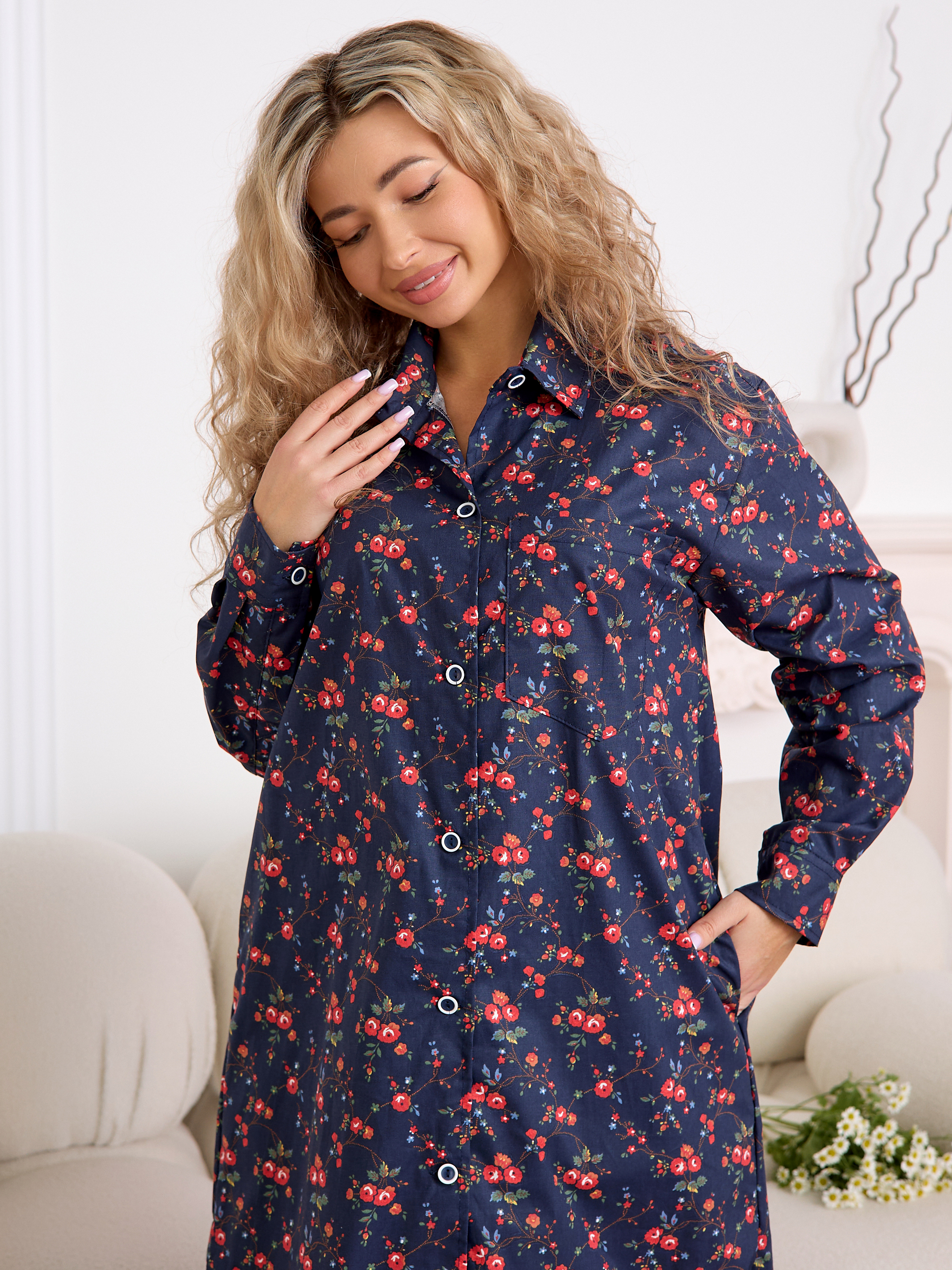 Уютный халат‑рубашка прямого кроя для дома и отдыха. Модель сочетает современный оверсайз‑силуэт с аутентичным принтом, воссозданным по образцам тканей Куваевской мануфактуры (1889–1915 гг.), ткань производства компании Шуйские ситцы.