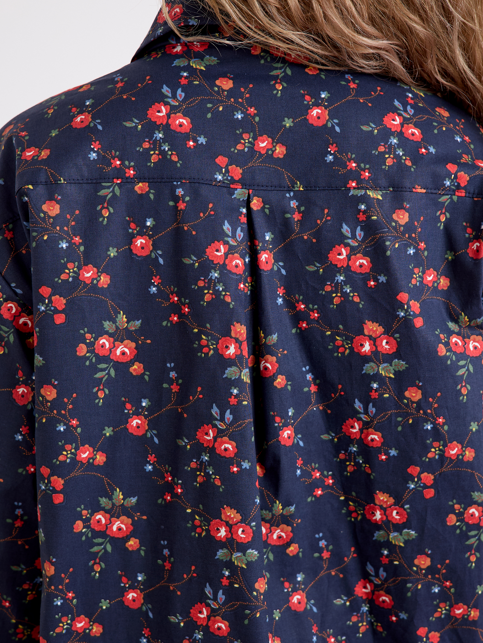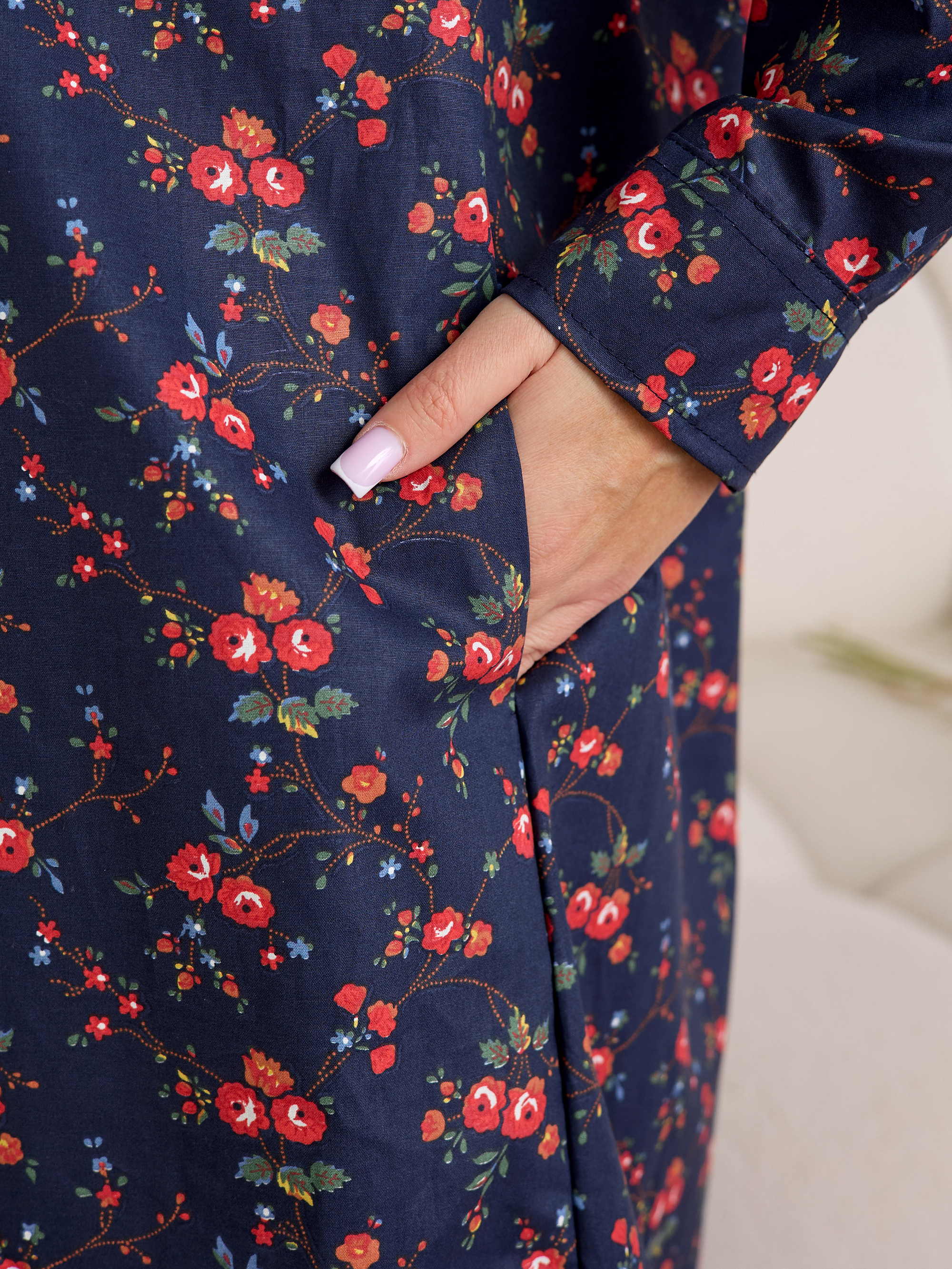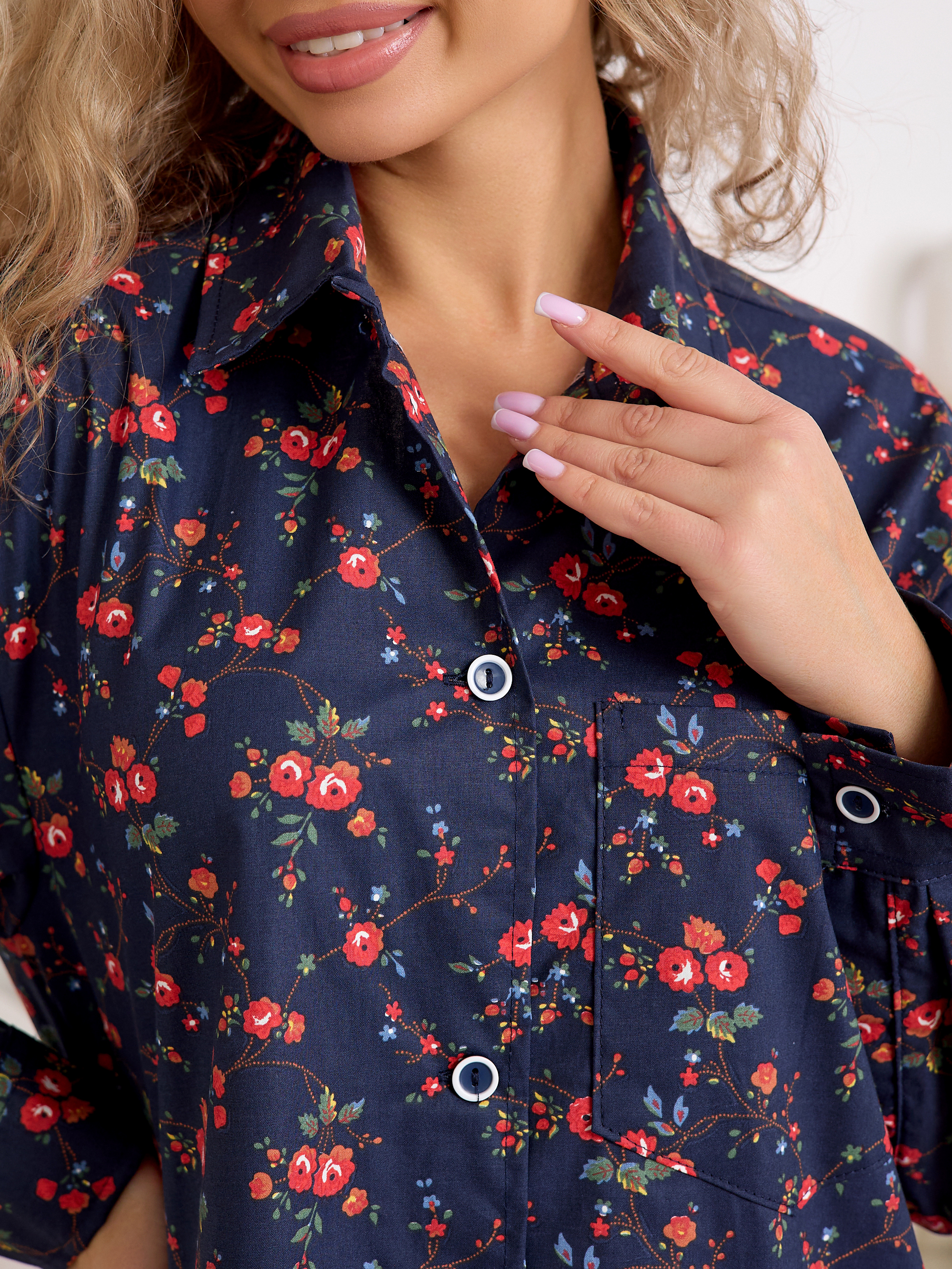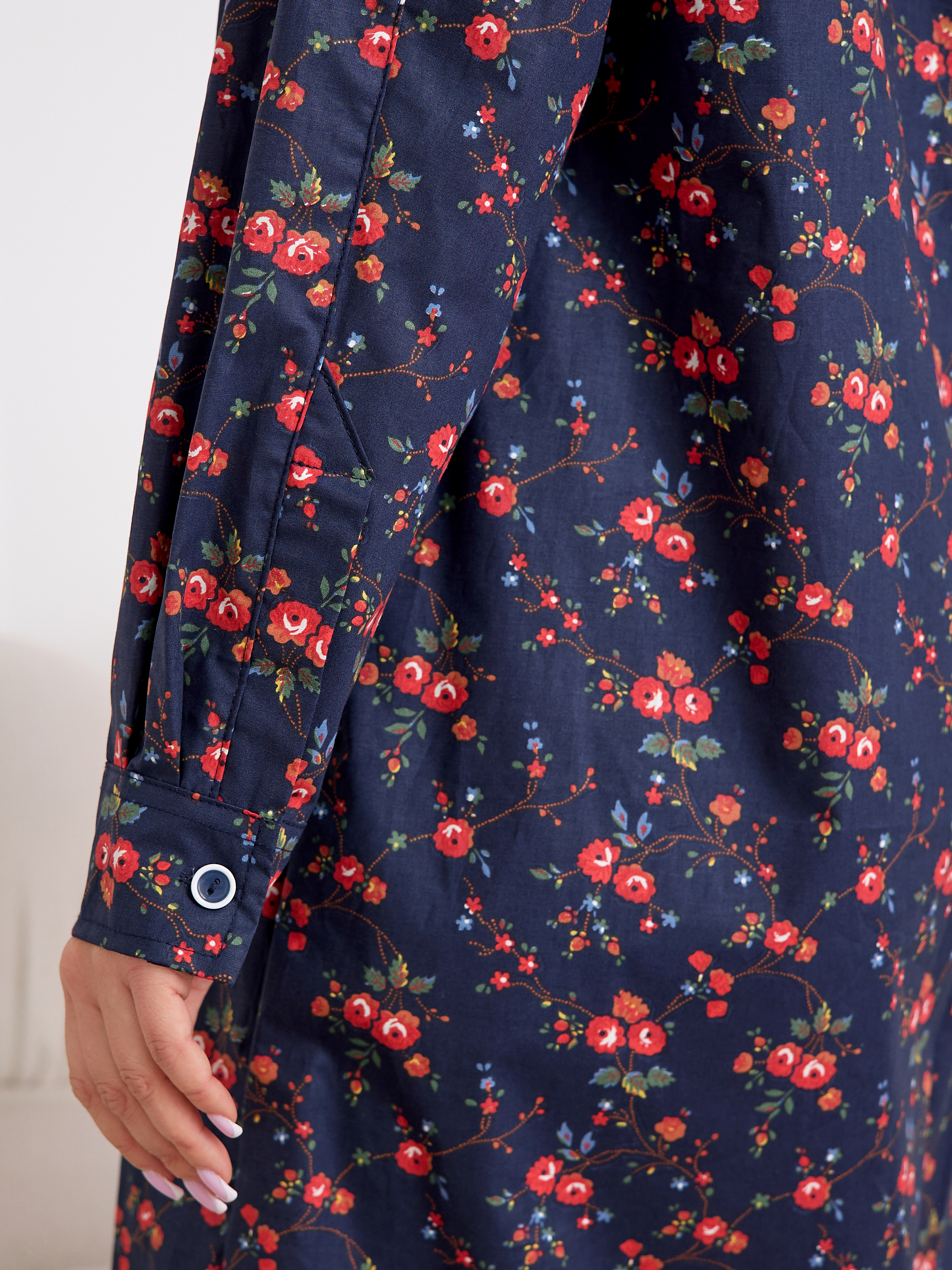 Уютный халат‑рубашка прямого кроя для дома и отдыха. Модель сочетает современный оверсайз‑силуэт с аутентичным принтом, воссозданным по образцам тканей Куваевской мануфактуры (1889–1915 гг.), ткань производства компании Шуйские ситцы.