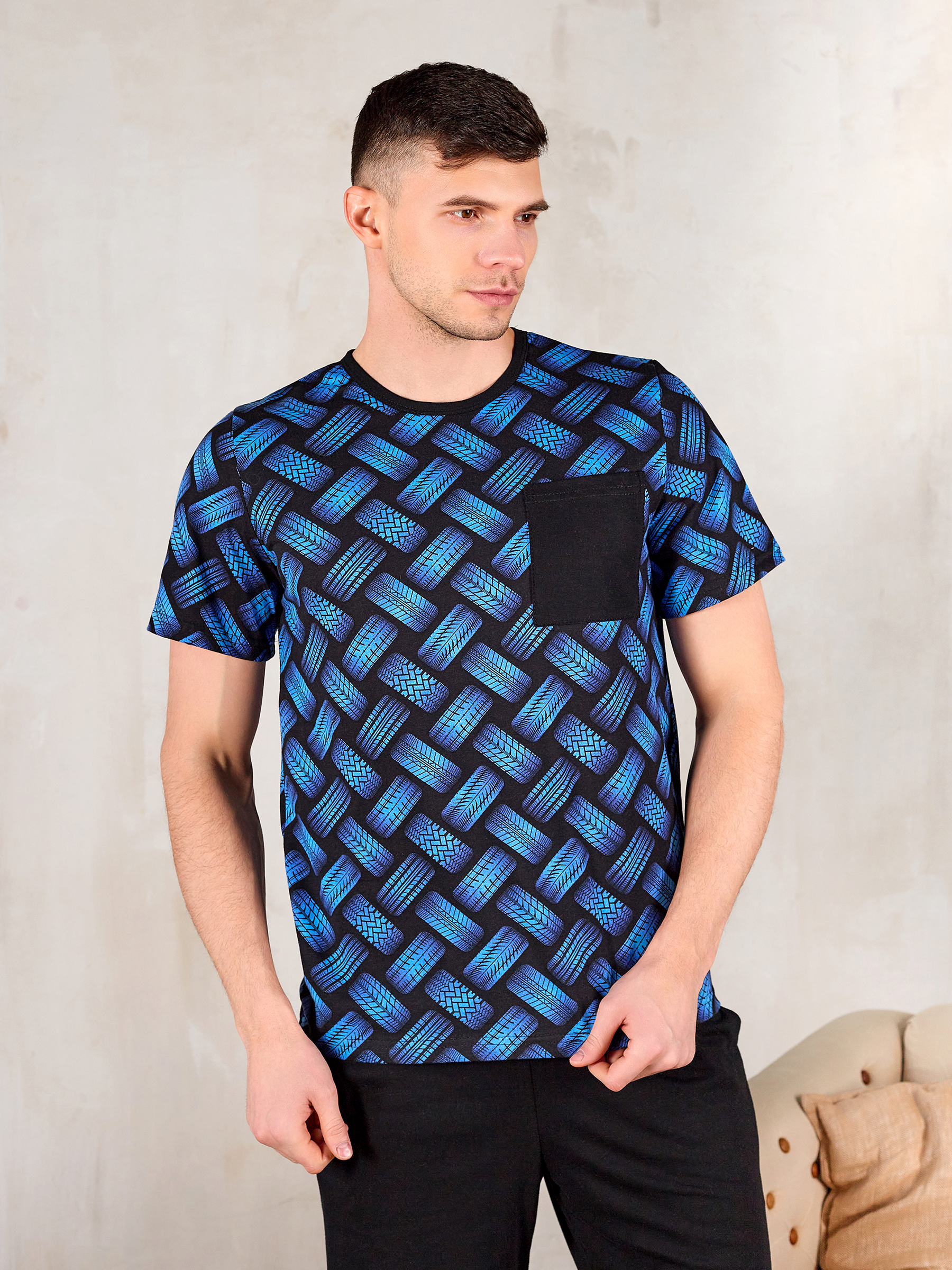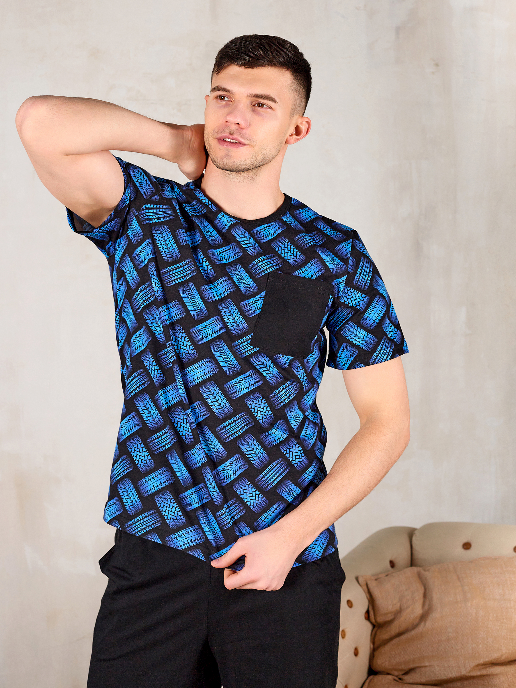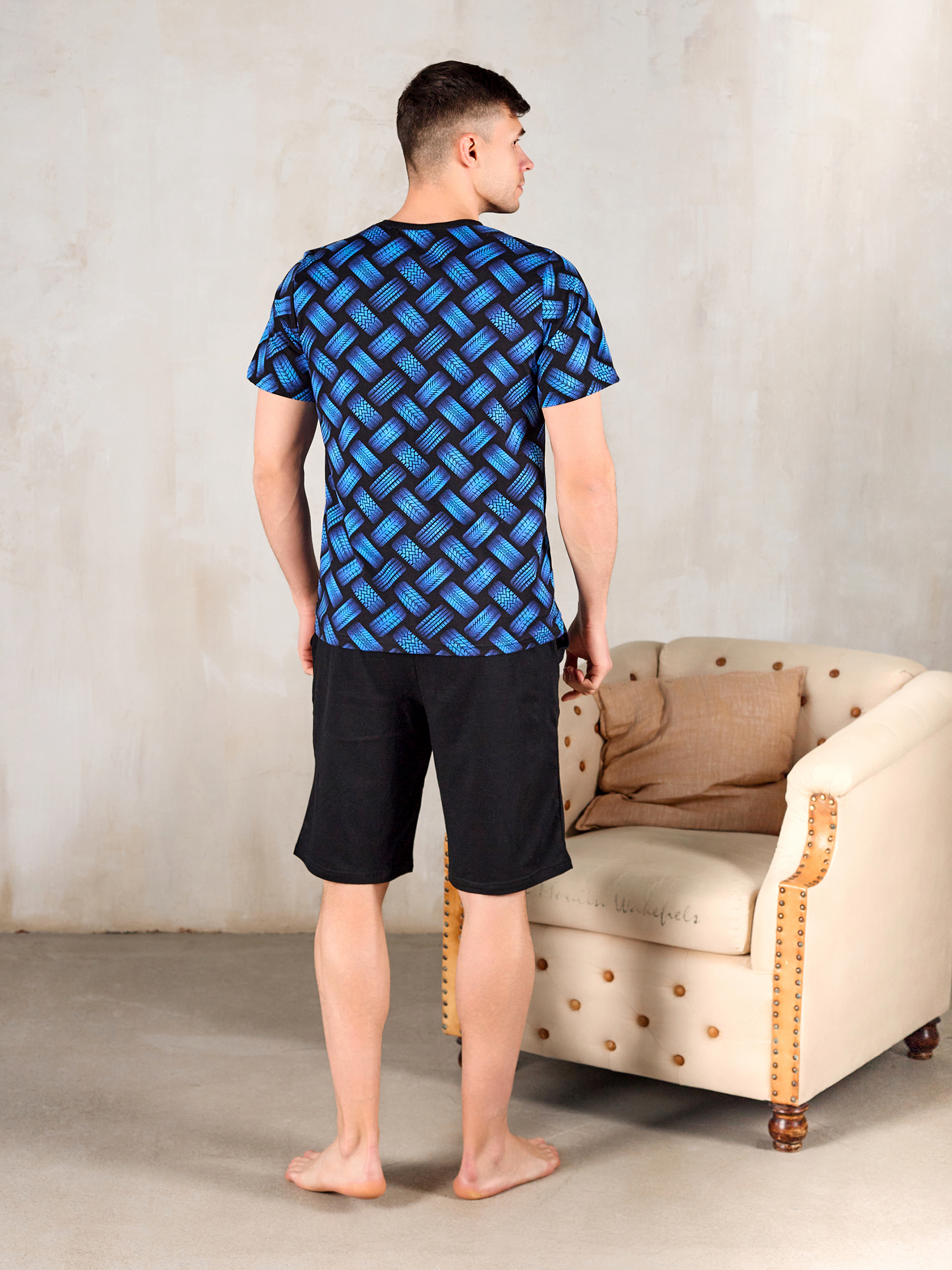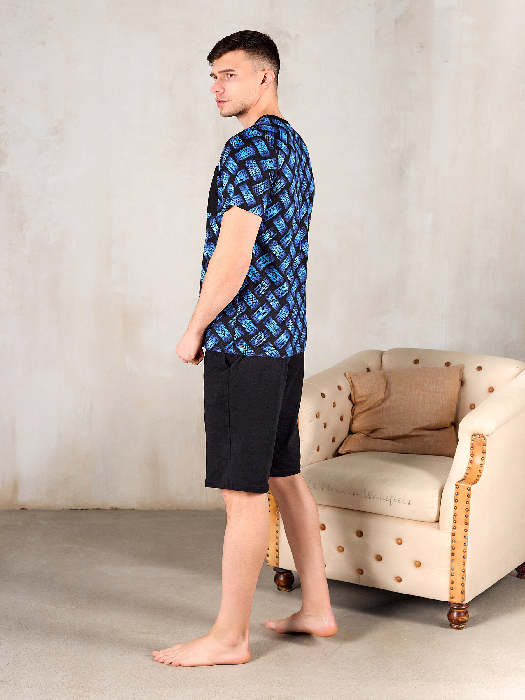 Покрой изделия обеспечивает свободу движения и подойдет на любую фигуру, а благодаря натуральному хлопковому материалу костюм для дома мужской с принтом прекрасно пропускает воздух и очень приятен к телу, что и нужно для домашней одежды.